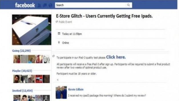 Ο λόγος για το Facebook page “E-Store Glitch – Users Currently Getting Free iPads,” η οποία προσπαθεί να πείσει τους επισκέπτες ότι μπορούν να πάρουν δωρεάν ένα iPad αν κάνουν κλικ σε ένα link πράγμα φυσικά που δεν ισχύει μιας και κάθε φορά που κάποιος πατάει πάνω στο link οι απατεώνες, κερδίζουν χρήματα καθώς και τα προσωπικά στοιχεία του χρήστη.